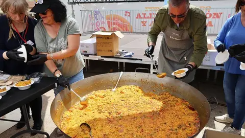 Por tercer año consecutivo, ASECEM ha vuelto este jueves a reunir a cientos de personas en la Feria de los Sabores de Alcázar de San Juan para compartir su ya tradicional "arroz solidario", una iniciativa promovida por la asociación empresarial, con la colaboración del Ayuntamiento, para recaudar fondos a beneficio de AFADIS (Asociación de Familias y Afectados de Discapacidad de Alcázar). En esta ocasión, según ha explicado una de las cocineras Rosa Gallego (de Hotel Ínsula Barataria) a elsemanaldelamancha.com, se han elaborado varias paellas de gran tamaño para unos 600 comensales, el doble que el año pasado; y se han utilizado 60 kilos de arroz, 60 de pollo, 200 de caldo, 40 de tomate, 40 de verdura, según los datos aportados por el presidente de ASECEM Eduardo García Villajos. Entre los comensales, gran parte de la Corporación Municipal, con la alcaldesa, Rosa Melchor, al frente y concejales de todos los grupos políticos.
