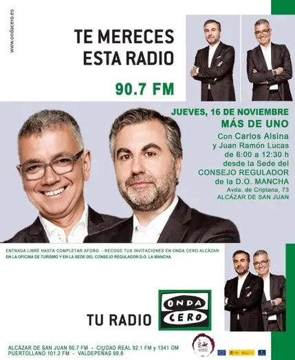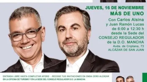 Carlos Alsina y Juan Ramón Lucas, el jueves 16, en directo, desde la sede del CRDO La Mancha