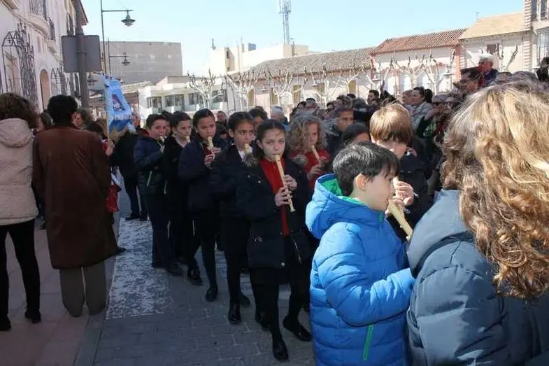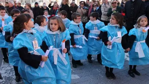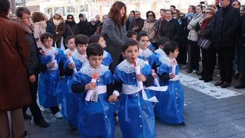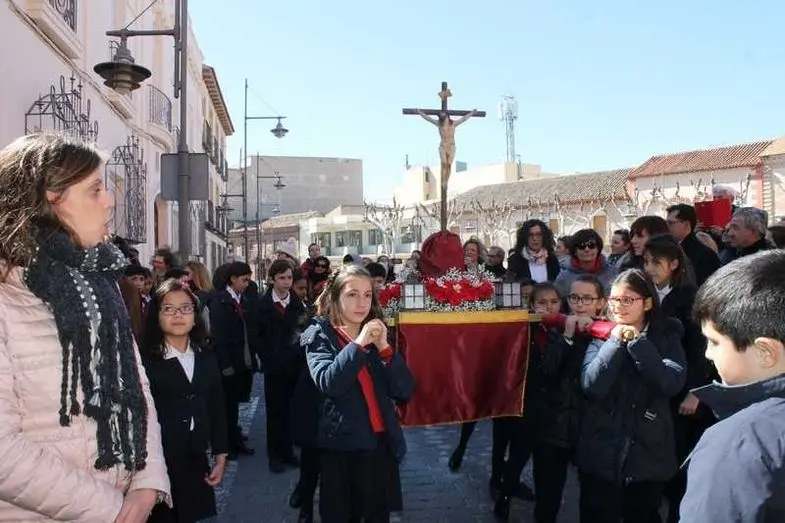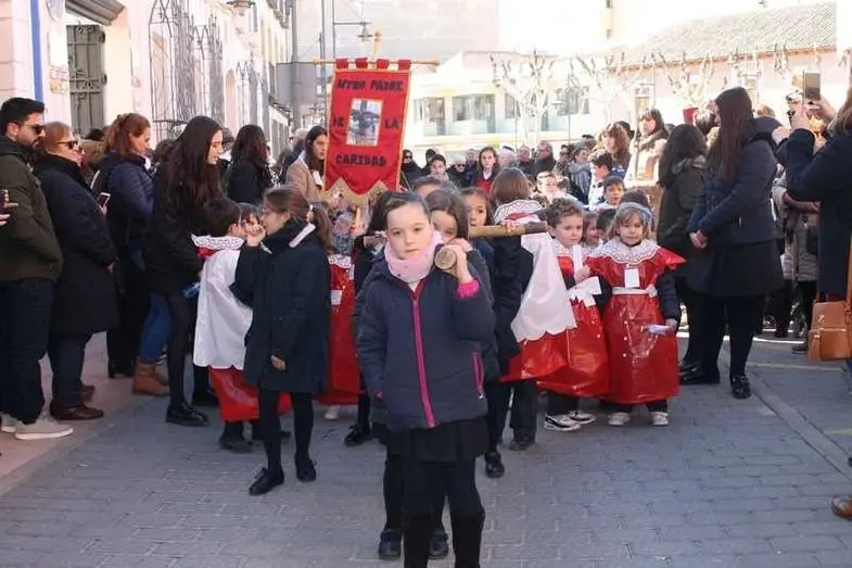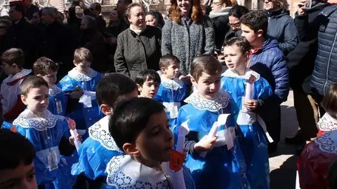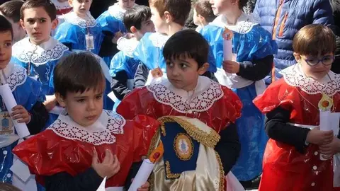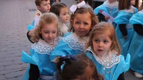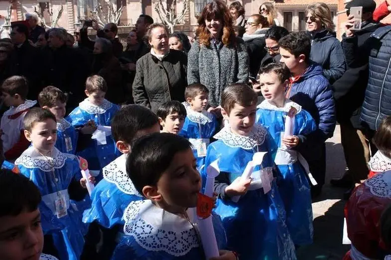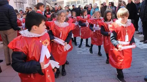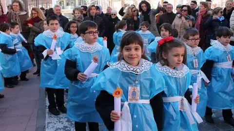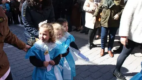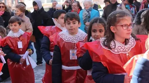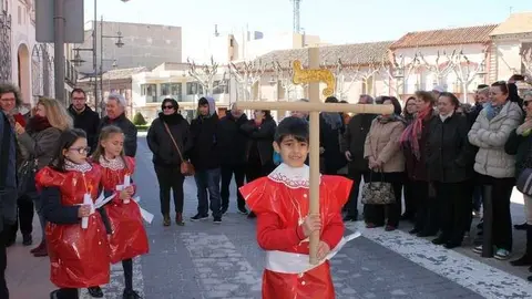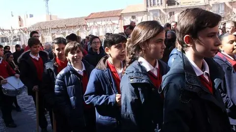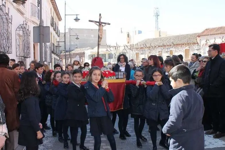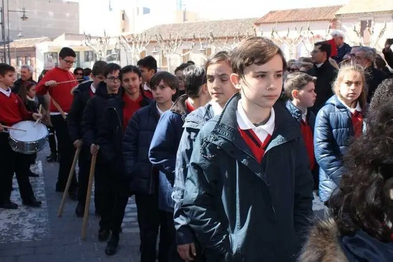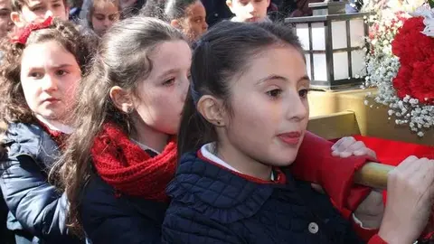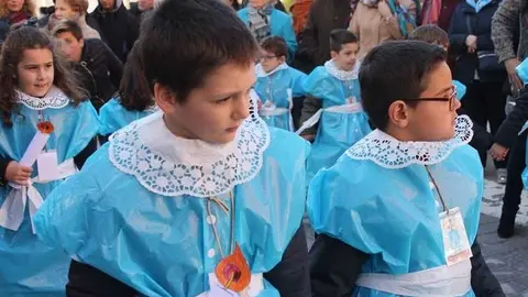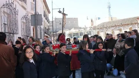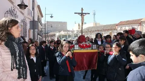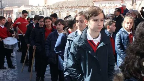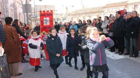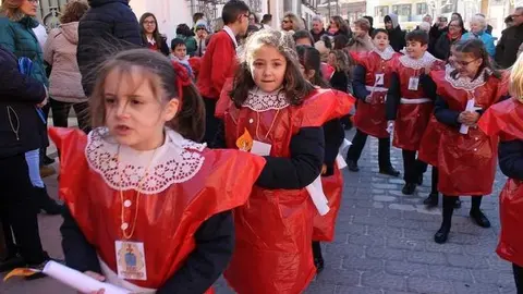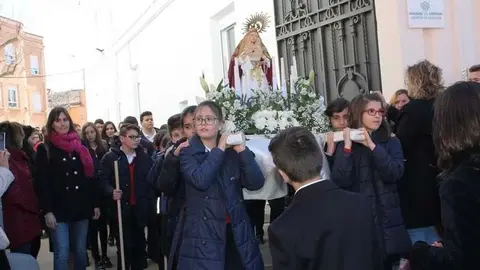 Multitudinaria procesión de los alumnos del colegio de la Sagrada Familia por las calles de Alcázar