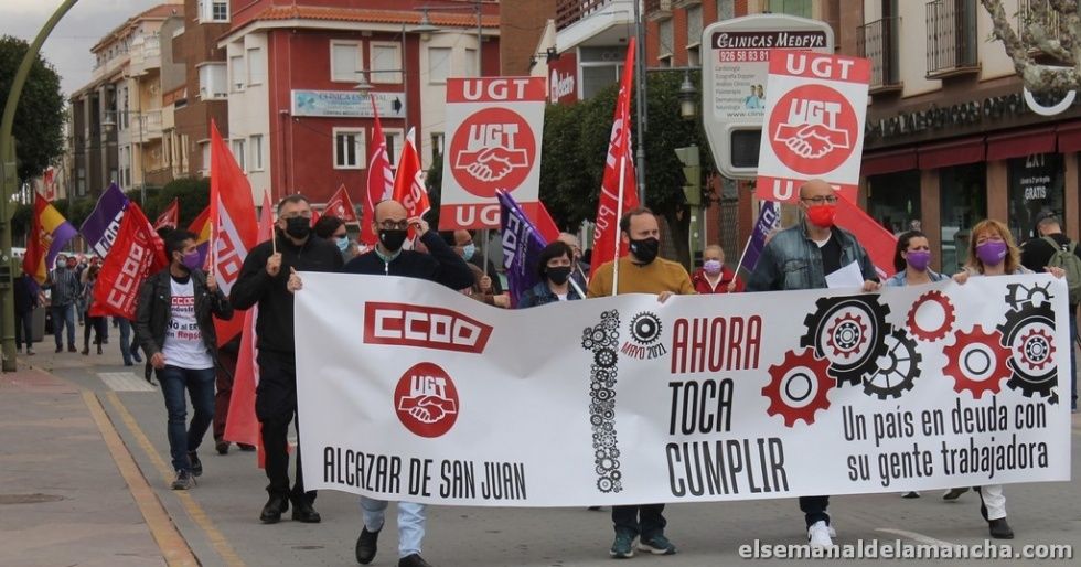 En su intervención, el responsable de CC.OO, en la zona de Alcázar y Tomelloso, Antonio Cervantes, ha señalado la importancia de volver a estar en la calle “tras la cruel pandemia que se está llevando un montón de vidas y de ilusiones”, y ha añadido esta crisis sanitaria también ha puesto en valor lo que es el mundo de los trabajadores, “que han salvado vidas y han salvado economías”, haciendo alusión a los numerosos colectivos que han estado al pie del cañón durante los momentos más duros de la pandemia, “por eso –ha dicho- es el momento de pasar de los aplausos al reconocimiento, a las subidas salariales, a tener más diálogo en el empleo, hay unos temas que hay que abordar como el salario mínimo, la negociación y otros muchos que afectan a los trabajadores y que hay que tratar ya”.