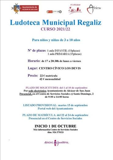 A partir del día 1 de septiembre, el Ayuntamiento de Alcázar de San Juan abre el plazo para la solicitud de matrícula en la “Ludoteca Regaliz”, que está ubicada en las instalaciones del Centro Cívico Los Devis y que cuenta con 30 plazas para niños y niñas de entre 3 y 10 años. Las solicitudes pueden presentarse de manera telemática o presencial.