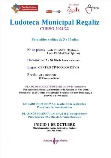 A partir del día 1 de septiembre, el Ayuntamiento de Alcázar de San Juan abre el plazo para la solicitud de matrícula en la “Ludoteca Regaliz”, que está ubicada en las instalaciones del Centro Cívico Los Devis y que cuenta con 30 plazas para niños y niñas de entre 3 y 10 años. Las solicitudes pueden presentarse de manera telemática o presencial.