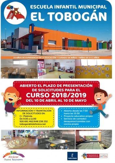La Escuela Infantil Municipal "EL TOBOGÁN" abre el plazo de presentación de solicitudes de matrícula para curso escolar 2018/2019 del 10 de abril a 10 de mayo. Las familias interesadas en conocer el proyecto educativo de la Escuela Municipal y sus instalaciones pueden hacerlo previa cita con la dirección del centro en el teléfono 648238232 - 926691462.