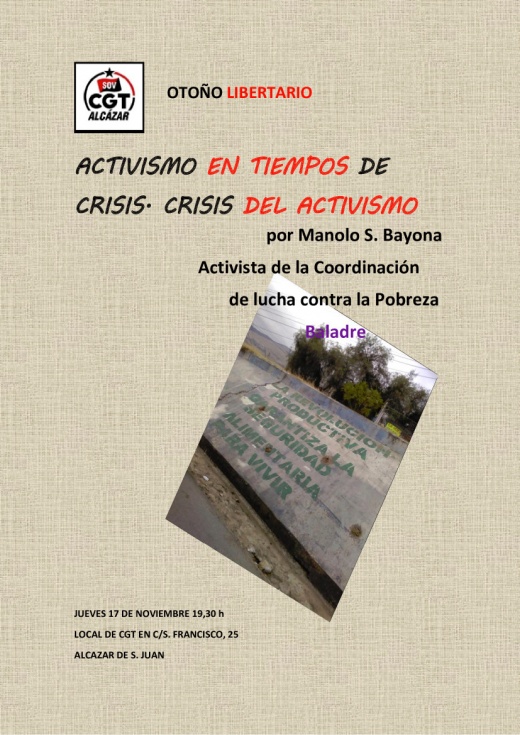 En el marco del Otoño Libertario, el SOV de CGT Alcázar de S. Juan informa sobre la Charla que ofrecerá este jueves en la sede local de este sindicato Manolo S. Bayona, reconocido activista desde años en la Coordinación de Lucha contra la Pobreza, Baladre, y conocedor de múltiples militancias y activismos.