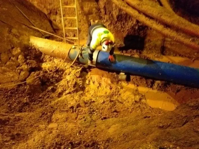 La avería consistía en la rotura de un tubo de fibrocemento de 400mm de diámetro y 6 metros de longitud. Y la reparación, en la sustitución del mismo por uno nuevo de fundición dúctil del mismo diámetro, instalado con dos uniones de alta tolerancia, uno en fibrocemento y otro de fundición dúctil.