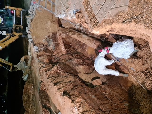 La avería consistía en la rotura de un tubo de fibrocemento de 400mm de diámetro y 6 metros de longitud. Y la reparación, en la sustitución del mismo por uno nuevo de fundición dúctil del mismo diámetro, instalado con dos uniones de alta tolerancia de fundición.