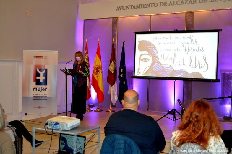 jóvenes alcazareños Alba de la Rosa y Carlos Moreno; para continuar con la primera intervención a cargo de Helena Ballesteros, profesora durante los últimos 26 años del colegio Gloria Fuertes, pintora, artista y responsable de la exposición "La inteligencia de Hipatia. Paños Hipáticos", junto al músico Juan Carlos Navas (inaugurada el sábado pasado en el Museo Municipal). Ballesteros ha recordado quién fue Hipatia de Alejandría, personaje histórico de los siglos IV y V, mujer matemática, física y filósofa,con grandes dotes para la ciencia. Ejemplo de mujer luchadora que los asistentes al acto han podido conocer más a fondo a través de un audiovisual proyectado
