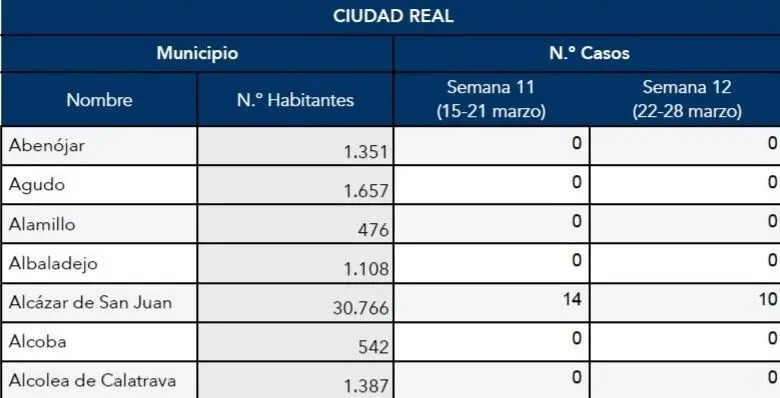 En Alcázar de San Juan, de los 14 casos registrados en la semana 11, se ha pasado a 10 casos más en la semana 12, con lo que la cifra de positivos se sitúa en 24.