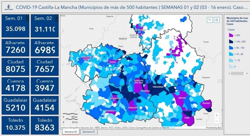 Según los datos publicados por Salud Pública, en Alcázar de San Juan se han registrado, en la primera semana del año, 528 casos (del 3 al 9 de enero); y en la segunda 591 (del 10 al 16 de enero). La incidencia acumulada en la última semana es de 1.920,95 casos por 100.000 habitantes, periodo en el que ya se computa Reyes Magos.