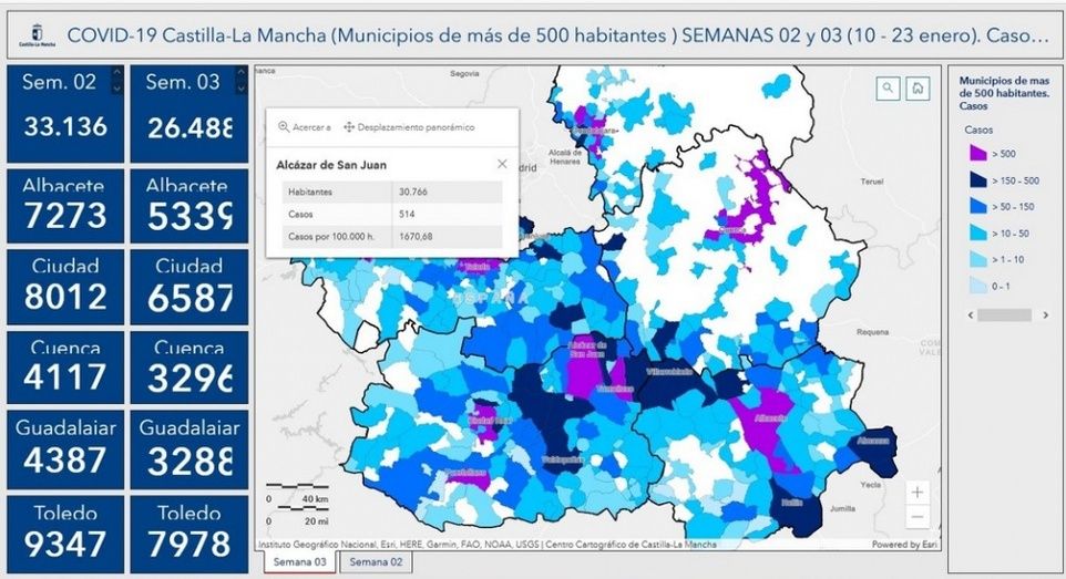 Según los datos publicados por Salud Pública, en Alcázar de San Juan se han registrado, en la semana 2 (del 10 al 16 de enero), 622 casos y en la semana 3 (del 17 al 24 de enero), un total de 514. La incidencia acumulada en la última semana es de 1.670,68 casos por 100.000 habitantes, una incidencia menor a la de la pasada semana.
