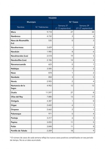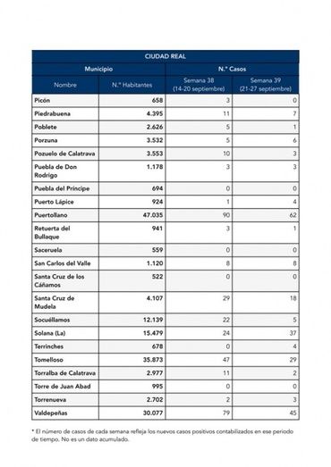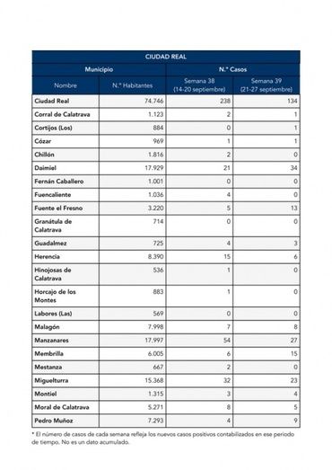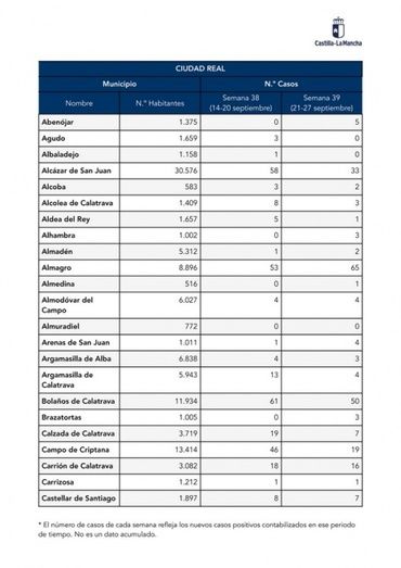 Campo de Criptana, por su parte, suma 19 nuevos casos en la última semana (del 21 al 27 de septiembre), y los acumula a los 46 de la semana 38 (del 14 al 20), con lo que registra 65 positivos entre ambas semanas.