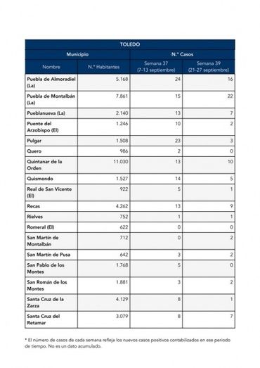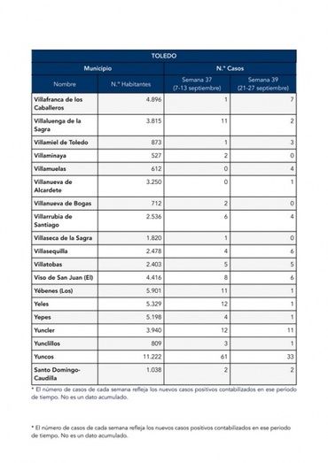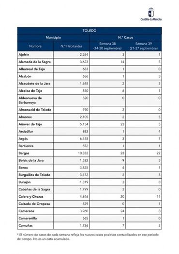 Socuéllamos registra en la semana 39, 5 casos nuevos y en la semana 38, un total de 22, es decir, 27 en total: y Tomelloso, ha registrado 29 positivos en la semana 39 que sumados a los 47 de la semana 38 se elevan a 76 en total, un ligero descenso con respecto a la semana pasada.