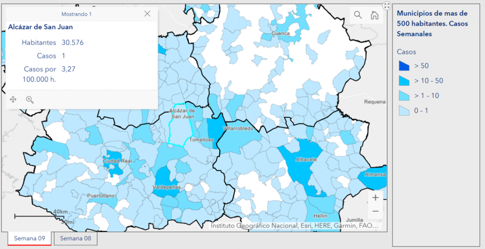 En Alcázar de San Juan, el registro de las dos semanas suma 5 nuevos contagios, 4 en la semana 8 y 1 en la semana 9. Campo de Criptana, por su parte, registra 3 en los quince días, 1 en la semana 8 y 2 en la semana 9. Herencia también experimenta un descenso considerable, con 6 contagios en la semana 8 y ninguno en la semana 9. Manzanares suma 10 en total, 8 y 2, respectivamente; Pedro Muñoz, un único caso en los quince días y registrado en la semana 8, pues en la semana 9 no ha tenido ninguno; Socuéllamos pasa de 2 a 15, sumando 17 en total (el municipio de esta zona que más contagios ha registrado en esta ocasión); Tomelloso, registra 3 en la semana 8 y 7 en la semana 9, es decir 10 en las dos semanas; y finalmente, Arenales de San Gregorio, se mantiene sin positivos.