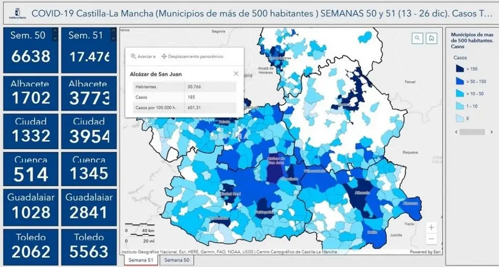 El número de nuevos casos positivos por coronavirus registrados en los municipios de La Mancha se ha disparado en las últimas dos semanas de seguimiento epidemiológico, con un incremento importante en municipios como Alcázar de San Juan, que ha registrado en las semanas 50 (del 13 al 19 de diciembre) y 51 (del 20 al 26 de diciembre) un total de 273 positivos, 88 en la semana 51 y 185 en la semana 52, según los datos aportados por la Consejería de Sanidad.