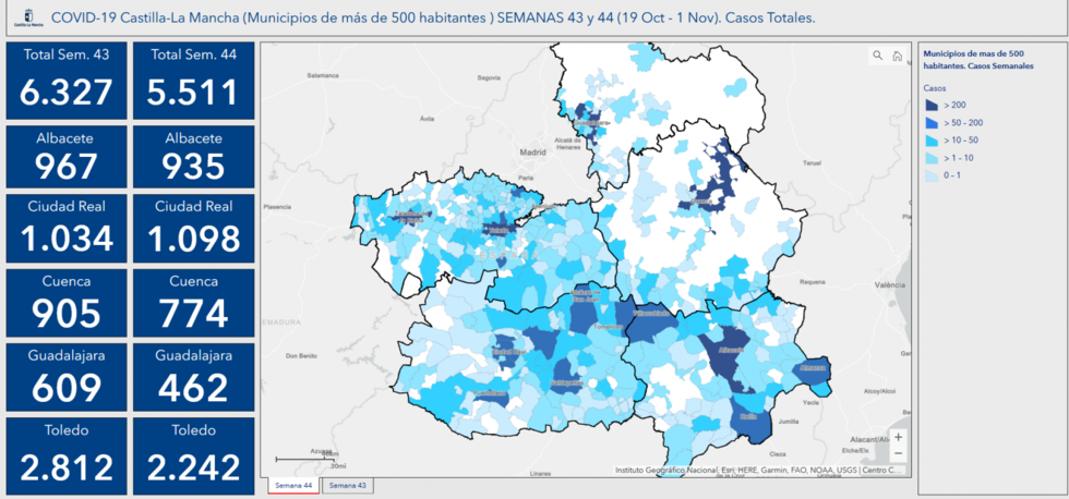 Las cifras en Herencia registran 38 casos en las dos semanas, con 18 en la semana 43 y 20 en la 44. Pedro Muñoz suma, por su parte, 17 más 6 casos, con un total de 23; Socuéllamos, 37 más 54 casos, es decir 91; los mismos que en Tomelloso, donde los positivos en dos semanas también son 91, 43 en la semana 43 y 48 en la semana 44.