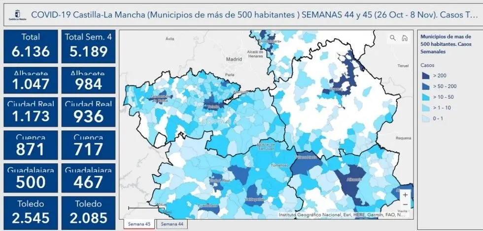Por lo que respecta a los municipios de la Mancha toledanada, destacar que Villacañas es el municipio más afectado con un total de 31, pero con un gran descenso en la última semana, ya que ha pasado de 25 positivos en la semana 44 a la 6 en la semana 45; Quintanar de la Orden es el segundo más afectado, con 28 casos en quince días, 20 en la semana 44 y 8 en la semana 45, también con un importante descenso.