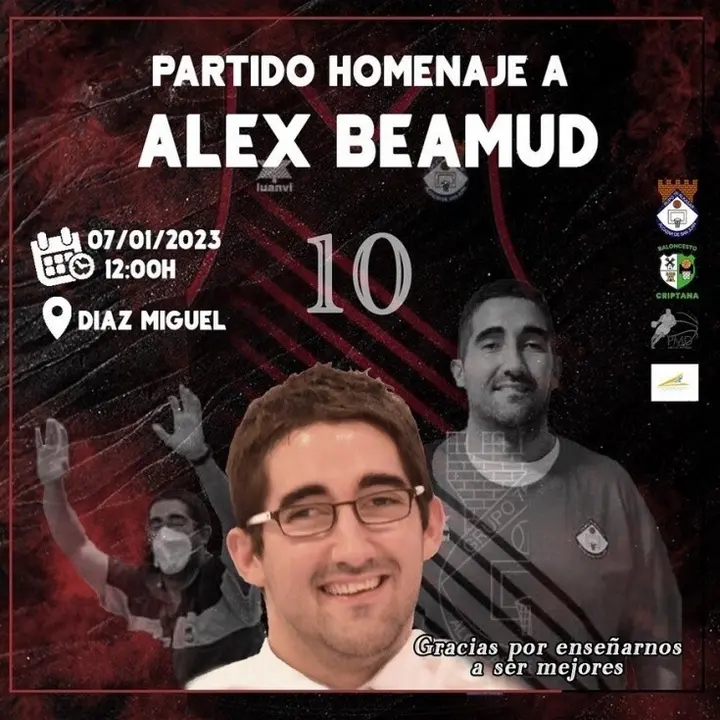 Este sábado, a partir de las doce de la mañana en el pabellón Antonio Díaz-Miguel, los amigos de Alex Beamud junto a los clubes donde perteneció como jugador y entrenador, Grupo 76 Alkasar, CB Criptana y CB Miguel Esteban, y el Instituto Municipal de Deportes de Alcázar de San Juan, rendirán un sentido y merecido homenaje a Alex Beamud, quien tristemente falleció de manera inesperada el pasado 16 de Diciembre con tan sólo 35 años.