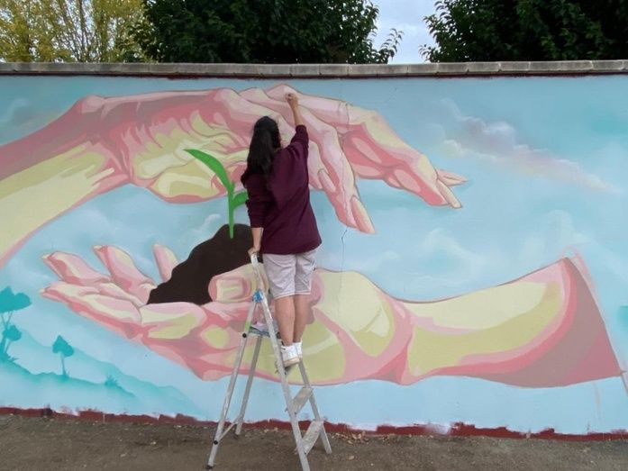 Según explicaron los propios artistas, el mural comenzó a proyectarse hace un mes aproximadamente, pero hasta el viernes no se hicieron los bocetos sobre la pared ni demás preparativos. Ayer sábado comenzó el trabajo colaborativo de los cuatro autores, cada uno con su estilo y técnica, plasmando en la pared elementos naturales y a la vez representativos de sus distintas obras, como las manos pintadas por la muralista Rosana Colors, especialista de retratos y formas humanas. Artista que, en declaraciones a la prensa, agradeció el cambio experimentado en Alcázar, donde la aceptación de los graffittis como arte urbano, no solo entre la población sino también a nivel institucional, ha evolucionado favorablemente con el paso del tiempo. "Cuando yo tenía 15 o 16 años ir al Ayuntamiento con una propuesta como ésta era impensable. Estaba prohibido pintar con spray en la calle", apuntó Rosana, quien se califica como muralista y no graffitera, "pues graffitero es quien pinta letras (rótulos) y en mi caso, prefiero el retrato o las figuras humanas".