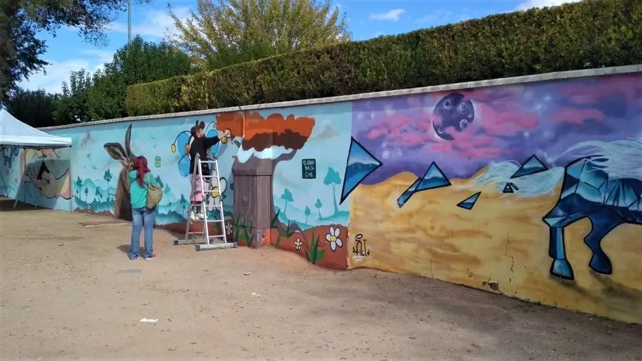 Cuatro conocidos artistas del mundo graffitero han estado este fin de semana plasmando su obra en una de las paredes públicas de Alcázar de San Juan, concretamente en uno de los muros de la piscina cubierta (salida al recinto ferial), donde desde esta tarde puede contemplarse el resultado de un proyecto colaborativo, promovido por la Concejalía de Juventud: Un mural de 36 metros con el que cerrar el ciclo de decoración y embellecimiento urbano con graffitis llevado a cabo durante los últimos años en distintos lugares de la ciudad (dedicados a la Igualdad, la diversidad, el deporte, la cultura...).