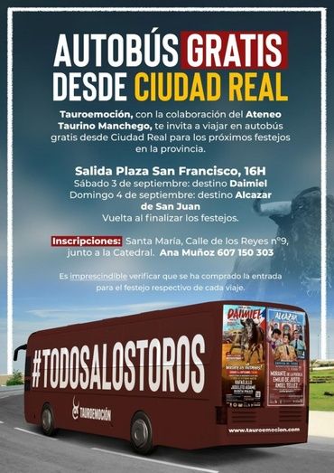 La mercantil Tauroemoción, encargada de la gestión de las plazas de toros de Daimiel y Alcázar de San Juan, junto con el Ateneo Taurino Manchego han fletado autobuses desde Ciudad Real para ir a los festejos taurinos de Daimiel y Alcázar de San Juan los próximos días 3 y 4 de septiembre, respectivamente.