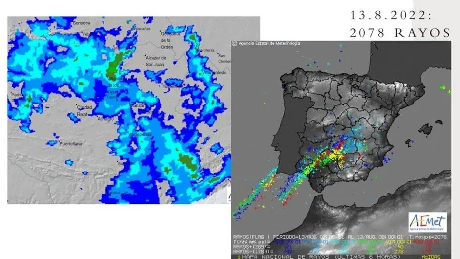 En este sentido, la AEMET C-LM informa de 2.078 rayos en las 6 últimas horas. Afectan a las provincias de Ciudad Real Cuenca y Toledo. Las precipitaciones son de unos 4 litros/m2 en Loa Llanos (Albacete B.Aérea), 3.4 en Tabarra y unos 3 en Valdepeñas y Fuencaliente; 2,8 en Alberca de Záncara.