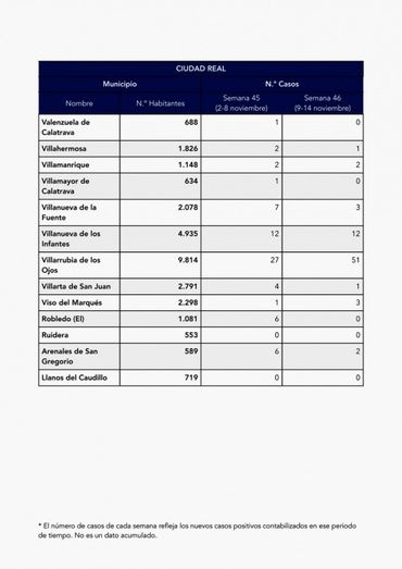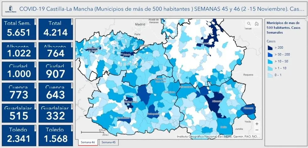 En Villacañas, el total es de 52 casos nuevos: 28 en la semana 45 y 24 en la semana 46.