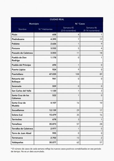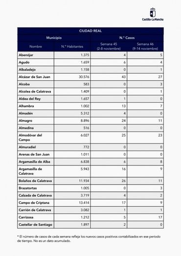 Manzanares registra 28 nuevos casos en total, con 11 en la semana 45 y 17 en la semana 46. En Pedro Muñoz, la cifra total se sitúa en 12, con 8 en la semana 45 y 4 en la semana 46. En Socuéllamos, la cifra asciende a 46 entre las dos semanas; y en Tomelloso, el total es de 85 nuevos casos en quince días.