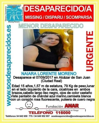 La Policía Nacional de Alcázar de San Juan busca a la joven Naiara Lorente Moreno, de 15 años de edad, que en el momento de su desaparición vestía pantalón de chándal azul marino y camiseta banca con un corazón rosa fluorescente. Fuentes policiales han confirmado a El Semanal que la denuncia por desaparición se puso el pasado jueves por la noche, y hasta el momento, la joven está en paradero desconocido. Se trata de la misma adolescente que también desapareció el pasado mes de marzo y fue hallada en Albacete.