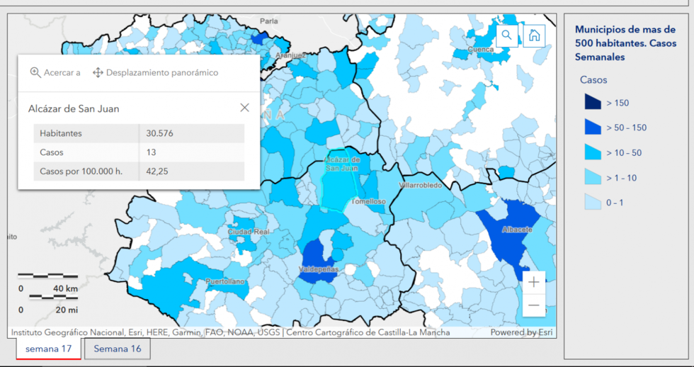 Los datos de seguimiento epidemiológico correspondientes a las semanas 16 y 17 de 2021 (del 19 de abril al 2 de mayo) facilitados por la Consejería de Sanidad antes de finalizar el Estado de Alarma muestran una tendencia a la estabilización en la comarca, con cifras desiguales en los municipios pero poco preocupantes. Comparando las dos semanas, en la mayoría se observa una tendencia a la baja; aunque también se observan subidas en municipios como Manzanares o Tomelloso.
