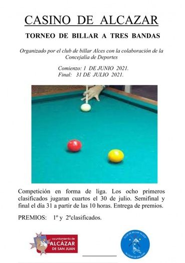 El 1 de junio comienza en el casino de Alcázar la Liga de billar a tres bandas 2021. Participan 20 jugadores, con observanción escrupulosa de las medidas higiénico-sanitarias personales por todos conocidas (mascarillas, distancia, lavado de manos) y las propias del local (limitación de personas, ventilación y control de CO2) así como las específicas señaladas por la Real Federación para este deporte (limpieza constante de mesas, marcadores, bolas, etc).