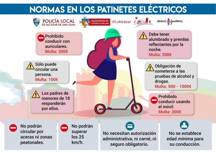 La Policía Local del Ayuntamiento de Alcázar de San Juan va a iniciar una campaña informativa sobre las condiciones de circulación de vehículos de movilidad personal, patinetes eléctricos, ante el aumento de la circulación de vehículos de estas características.