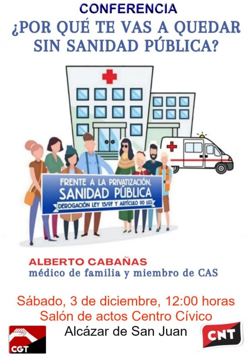 Los Sindicatos CNT y CGT de Alcázar de San Juan organizan una conferencia sobre la privatización de la sanidad pública, a la que invitan a participar al conjunto de la población, será este sábado 3 de diciembre a las 12:00 horas en el Centro Cívico de la ciudad.