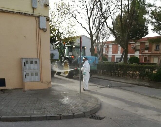 En la jornada de limpieza y desinfección de hoy se están utilizando 2 baldeadoras de calzada, 2 equipos de presión para aceras y mobiliario, y participan 8 trabajadores de la empresa de limpieza. Además hay 4 tractores de voluntarios, 5 personas y tres funcionarios más. Mañana continuarán las labores de desinfección con más efectivos.