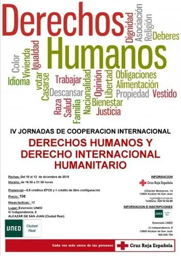A lo largo de estas Jornadas, se llevarán a cabo diversas actividades como las previstas el día 10 de diciembre, donde a partir de las 4:30 h. de la tarde, se podrá visitar en la UNED de Alcázar de San Juan la exposición sobre “los Objetivos de Desarrollo Sostenible” y se distribuirán folletos informativos sobre Derechos Humanos y Derecho Internacional Humanitario, celebrando el día Internacional de los Derechos Humanos, sumándonos a esta celebración. A continuación se llevará a cabo un Café Tertulia sobre “Los Derechos Humanos y Cruz Roja”, que correrá a cargo de D. Jerónimo Corrales Gómez, Educador Social y Coordinador Local de Cruz Roja Española en Alcázar de San Juan, pudiendo participar todas las personas que así lo deseen.