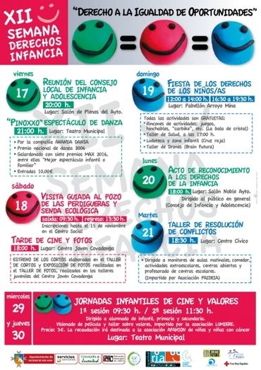 La Semana de los derechos de la infancia finaliza el 29 y 30 de noviembre, con las Jornadas de cine y valores que se llevarán a cabo en el Teatro Municipal, a cargo de la Fundación Lumiere, dirigidas a escolares del municipio, con entrada solidaria de 3€, que irán dirigidos a la Asociación AFANION de niñ@s con cáncer.