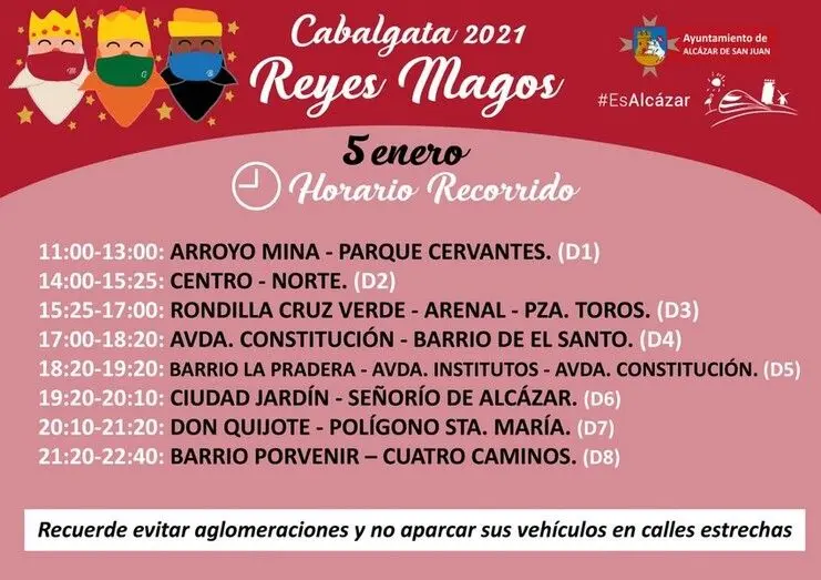 La última actualización del itinerario de la Cabalgata de los Reyes Magos en Alcázar de San Juan, el día 5 de enero, publicada por el Patronato Municipal de Cultura de la ciudad informa que el orden de la visita de los diferentes distritos se ha elaborado en función del mejor desarrollo entre unos y otros, dado que la duración total se estima en 10 horas y media sumando 103 kilómetros de recorrido. El distrito Centro se realizará fuera del horario comercial para evitar posibles aglomeraciones.