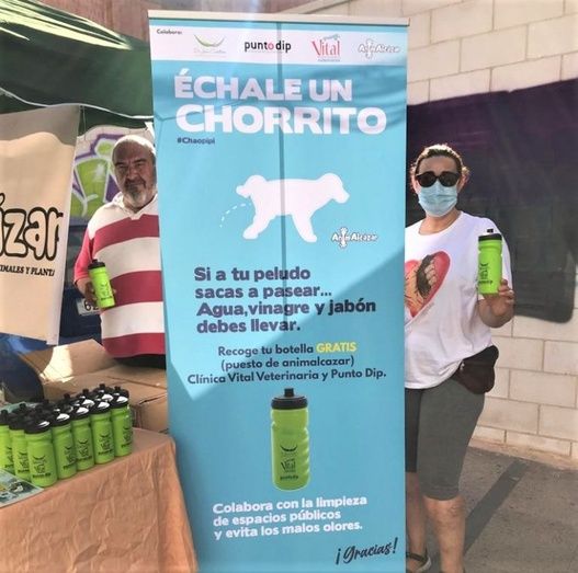 En el caso de esta nueva campaña, el lema lo dice todo: "Echale un chorrito", para evitar malos olores y suciedad, especialmente en el eje comercial (aunque el cumplimiento de la ordenanza se aplica igual en cualquier calle). Para ello, Animalcázar está distribuyendo, en el puesto instalado en la Castelar, las botellas o contenedores con agua que pueden verse en las fotografías de manera gratuita (aunque a cambio, se admiten donativos, pues Animalcázar necesita dinero para seguir funcionando).