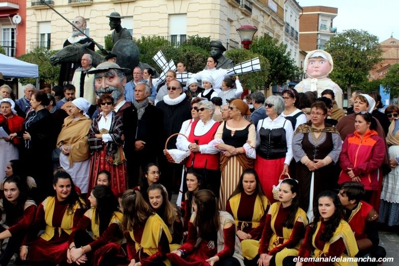 Personajes cervantinos con sus trajes del siglo de Oro, gigantes, cabezudos, músicos, bailarines, autoridades y vecinos han recorrido esta mañana distintas calles del barrio de Santa María para conmemorar el bautismo de Miguel de Cervantes, hijo de Blas de Cervantes Saavedra y Catalina López, bautizado en la iglesia de este barrio alcazareño el 9 de noviembre de 1558, con el nombre de Miguel, según aparece en el registro parroquial.