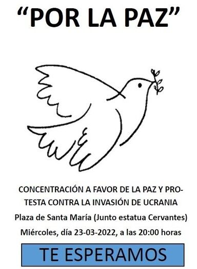 El Ateneo de Alcázar ha convocado para próximo miércoles, día 23, una concentración cuyo lema es POR LA PAZ, en repulsa a los acontecimientos execrables que están sucediendo en Ucrania en pleno siglo XXI. Tendrá lugar en la plaza de Santa María de Alcázar de San Juan a las 20:00h.