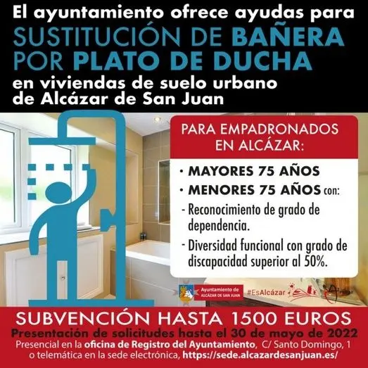 El Ayuntamiento de Alcázar de San Juan a través de la concejalía de Servicios Sociales ofrece ayudas económicas para la reforma del baño (sustitución de bañera por plato de ducha) en viviendas en suelo urbano. El importe destinado a esta convocatoria es de 80.000 € y las solicitudes se pueden presentar en el ayuntamiento hasta el 30 de mayo.