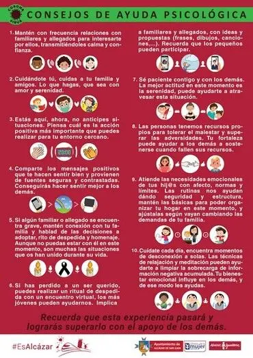 El Ayuntamiento de Alcázar de San Juan, a través del Centro de la Mujer, va a continuar ofreciendo consejos de ayuda psicológica en estos momentos de crisis sanitaria. Mensajes de apoyo, de ayuda o sobre cómo afrontar momentos intensos y dolorosos que se siguen produciendo en estos días.