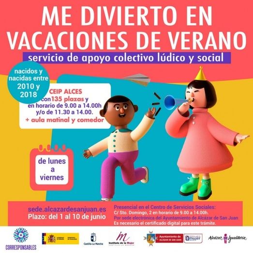 Se trata de la puesta en marcha del programa de apoyo colectivo “Me divierto en vacaciones de verano” con el fin de facilitar la conciliación familiar y laboral de las familias de Alcázar de San Juan.