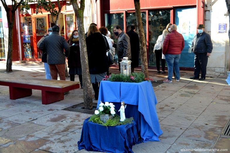 La inauguración, con mascarillas y distanciamiento social, ha reunido en la plaza a un grupo de belenistas, quienes, antes de destapar el Belén, han protagonizado un minuto de silencio y escuchado atentamente el manifiesto que ha leído Juan Carlos Quero, para depositar finalmente en un pequeño altar doce rosas blancas en recuerdo del presidente de la Federación de asociaciones belenistas, así como de todas las víctimas y enfermos del Covid. También se han escuchado palabras de reconocimiento para sanitarios y demás personal esencial.