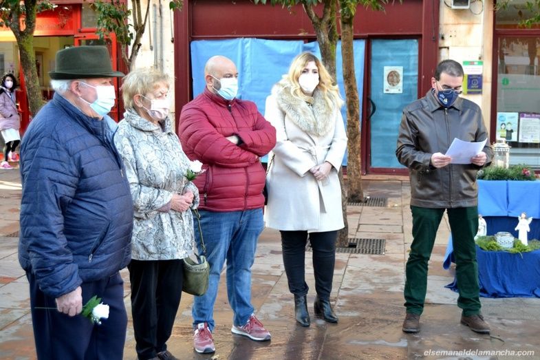 La inauguración, con mascarillas y distanciamiento social, ha reunido en la plaza a un grupo de belenistas, quienes, antes de destapar el Belén, han protagonizado un minuto de silencio y escuchado atentamente el manifiesto que ha leído Juan Carlos Quero, para depositar finalmente en un pequeño altar doce rosas blancas en recuerdo del presidente de la Federación de asociaciones belenistas, así como de todas las víctimas y enfermos del Covid. También se han escuchado palabras de reconocimiento para sanitarios y demás personal esencial.