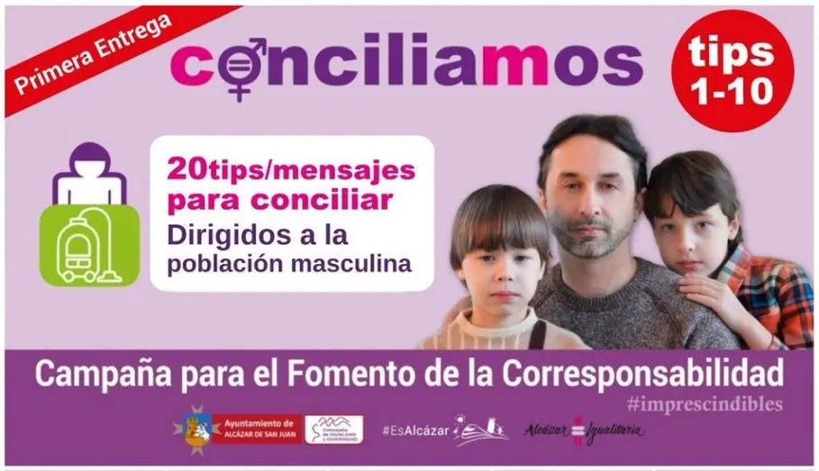 La campaña Conciliación y Corresponsabilidad Masculina, lleva el lema “Conciliamos” y consiste en lanzar periódicamente, a través de las redes sociales una serie de mensajes dirigidos a la población masculina con el objetivo de mejorar la conciliación y favorecer la reflexión en las familias. Un paso, el de la corresponsabilidad, #Imprescindible para avanzar en la igualdad.