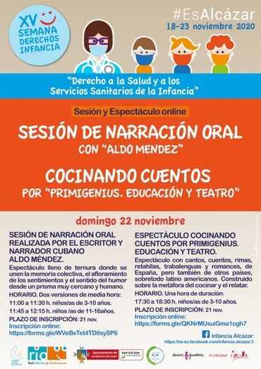 El 22 de noviembre en horario de mañana, se celebrará una Sesión de Narración oral con Aldo Méndez en formato on line y por la tarde espectáculo “Cocinando cuentos” por “Primigenius Educación y Teatro”, también en formato on line.