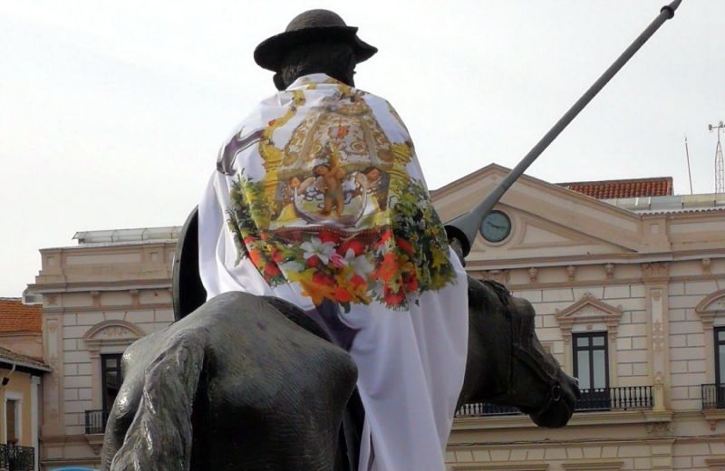 Parece que la estatua de Don Quijote de la plaza de España de Alcázar de San Juan no quiere perderse la romería de la Virgen de Criptana; y, como puede verse en la fotografía, alguien ha decidido esta mañana engalanarla para la ocasión con un improvisado manto, donde puede verse la imagen de la Virgen de Criptana, cuya romería se celebra hoy en la villa de los molinos vecina.