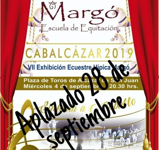 La organización de Cabalcázar 2019, exhibición Ecuestre de Hípica Margó, ha decidido aplazar al 28 de septiembre el espectáculo Sinfonía a caballo, “por problemas de logística de la plaza, y por ello hemos preferido que el trabajo e ilusión de nuestros chic@s y colaboradores pueda realizarse tranquilamente”, según informan.