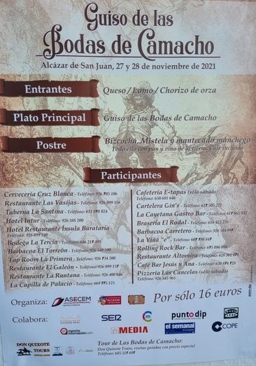 elaborar el guiso en directo y presentar las XVII Jornadas del Guiso de las Bodas de Camacho, programadas en Alcázar de San Juan los días 27 y 28 de noviembre. Fin de semana que se servirá el guiso, acompañado de lomo y chorizo de orza, queso manchego, bizcochá, mantecados y mistela, en los bares y restaurantes de la localidad. Este año, el precio será 16 euros (consultar establecimientos participantes en cartel).