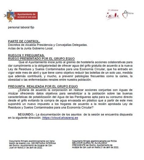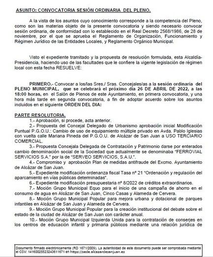 La Corporación municipal de Alcázar de San Juan celebrará este martes, 26 de abril, sesión ordinaria de Pleno correspondiente al mes de abril a partir de las 18:00 horas, en el que se debatirán algunos puntos como el compromiso y aprobación del Plan de medidas antifraude del Ayuntamiento de Alcázar y el expediente de modificación de la ordenanza fiscal de la Zona Azul entre otros.